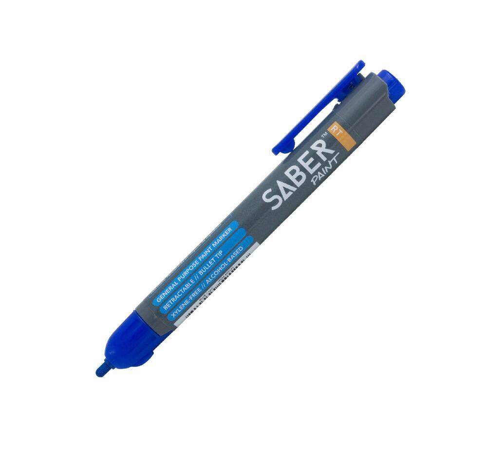 Free-up one hand to complete your task while never losing a cap again. The world's only capless paint marker, SaberPaint™ RT leaves a long-lasting, xylene-free, opaque mark. Without the fuss of a cap, SaberPaint™ RT offers reduce risk of dry-out which allows for cost improvements and better overall performance. Alcohol-based paint formula is prop 65 compliant and SaberPaint™ RT is proudly made in the USA. Remains permanent on almost any dry or damp/oily surface: metal, plastic, glass, paper, rubber, concrete, tile, wood, stone, vinyl. Our finer bullet tip allows for more precise marks for layout and cutting. More paint can be applied and the marker can be used at a 90-degree angle from the surface to achieve a more bold mark when desired. Available in 6 popular colors. Great for: builders, welders & steel fabricators, framers, plumbing & HVAC, farm & agriculture, automotive repair & manufacturing, aircraft & aerospace, shipbuilders, industrial & MRO, oil & gas, arts & crafts, DIY.