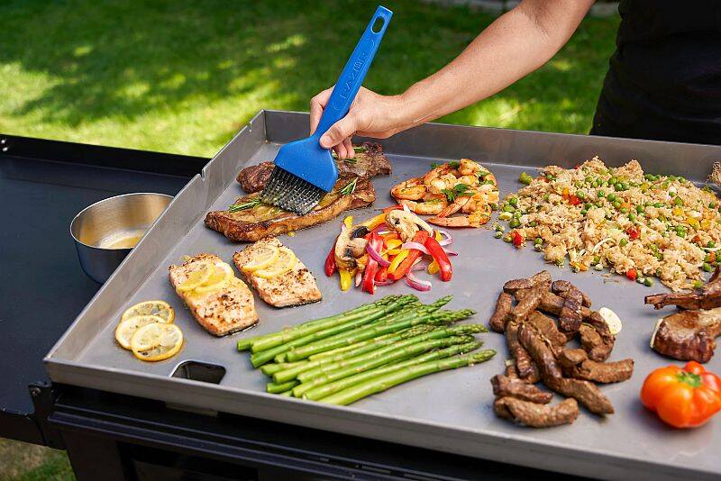 Baste your way to better griddling with the Razor® extra wide basting brush. The patented kickstand tilts the brush up to keep your workstation clean and clear while it also doubles as a hook to hang on the edge of your cookware. The silicone bristles are heat resistant up to 500 °F and they won’t stain or deform. Even the beaded bristles are designed to carry and spread liquids better than ordinary bristles. Let’s get cooking!