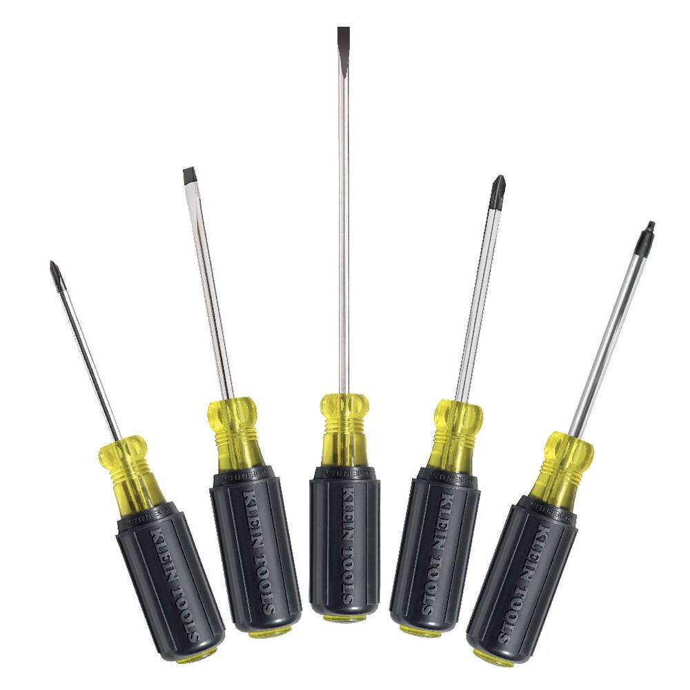 Klein Tools' 5-Piece Screwdriver set combines a variety of popular, general purpose tips. Included are #1, #2 Phillips, 3/16-Inch and 1/4-Inch Slotted and #2 Square tip drivers. Made in the USA, these drivers feature special heat-treated shafts for durability and Cushion-Grip™ handles for comfort.