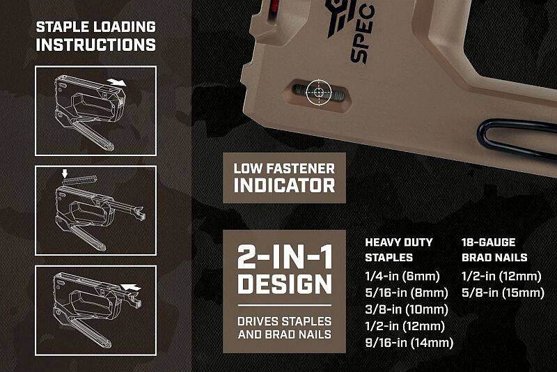 The 2-in-1 Heavy-Duty Staple Gun / Brad Nailer features Spec Ops patented Torsion Spring Technology for up to 50-percent easier squeezing that reduces hand fatigue and increases accuracy. Up to 25-percent lighter design with a military-grade composite housing, this staple gun is light on the belt yet delivers extreme staple driving power. With a patented, flip-out wire guide, this hand stapler allows for precision stapling over cables and includes a low fastener indicator for added convenience. The all-metal, reversible belt hook is designed for left and right-hand access. Perfect for insulation, house-wrap, fabric, upholstery, wood, or furniture repair. The bottom load design allows for rapid reloading and fail-safe jam clearing. All Spec Ops tools are backed by our five-star, hassle-free lifetime warranty, and with each purchase made, we support our nation’s heroes by donating 3-percent of proceeds to veteran and first responder causes.