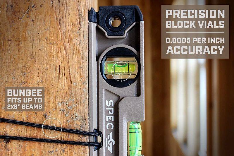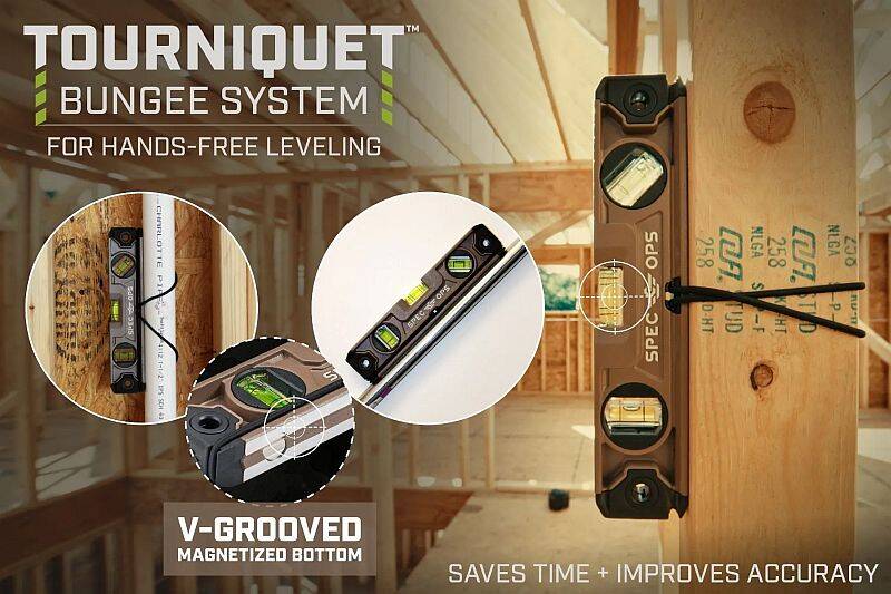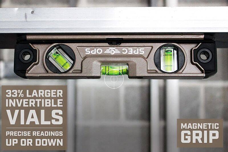 The Spec Ops Magnetic Torpedo Level with Bungee System packs a new level of performance and versatility than the old school levels. The patented bungee fastening system securely mounts the level to plastic pipes, 2 x 4s and other surfaces, while the rare earth magnets on the bottom securely grip to magnetic surfaces. Constructed with solid die-cast aluminum and then precision milled for elite durability, this level also features three high-visibility epoxy-locked acrylic block vials that deliver an accuracy of 0.0005-inch and offer guaranteed lifetime accuracy for plumb, level and 45-degree pitches. The 2% slope lines were also added to help you do more with less. And with a guarantee to deliver a lifetime of mission capability on the world’s toughest job sites, this level has been drop tested to exceed MIL-STD-810G. All Spec Ops tools are backed by our five-star, hassle-free lifetime warranty, and with each purchase made, we support our nation’s heroes by donating 3-percent of proceeds to veteran and first responder causes.