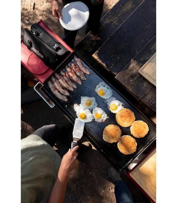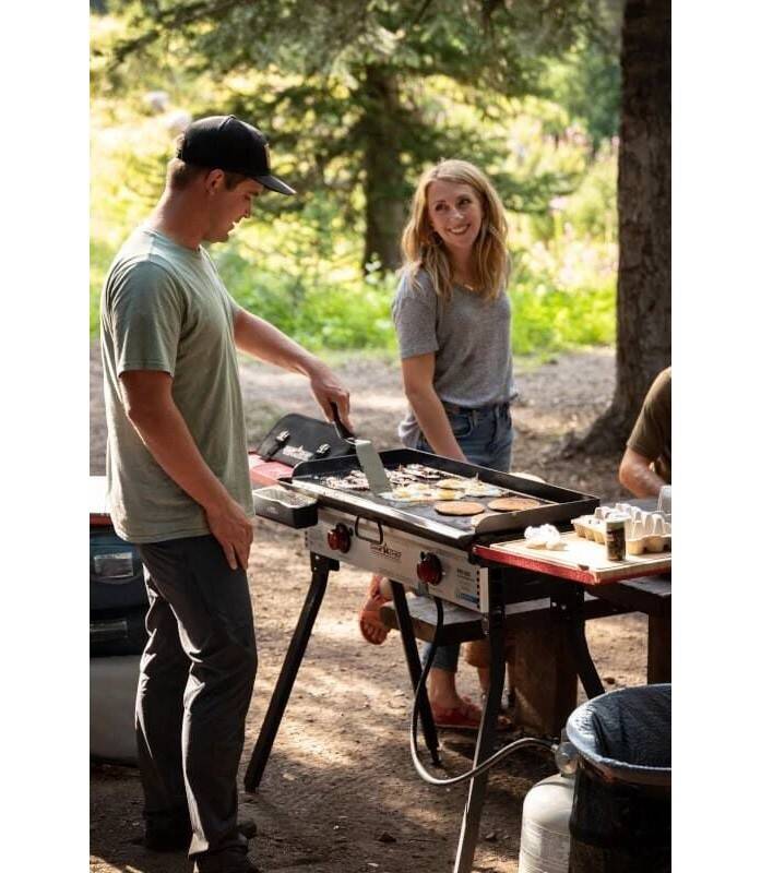 Make pancakes and eggs for breakfast and fajitas for lunch with this Professional Flat Top Griddle. Covering two burners, it is large enough to cook for the hungriest of crowds. This griddle is built with Camp Chef’s even heat design to minimize hot spots when cooking. Cooking and cleaning is easy because of its restaurant style high sides and convenient grease drain. Pre-seasoned with a True Seasoned Finish, this griddle is ready to use out of the box and has a natural cooking surface.