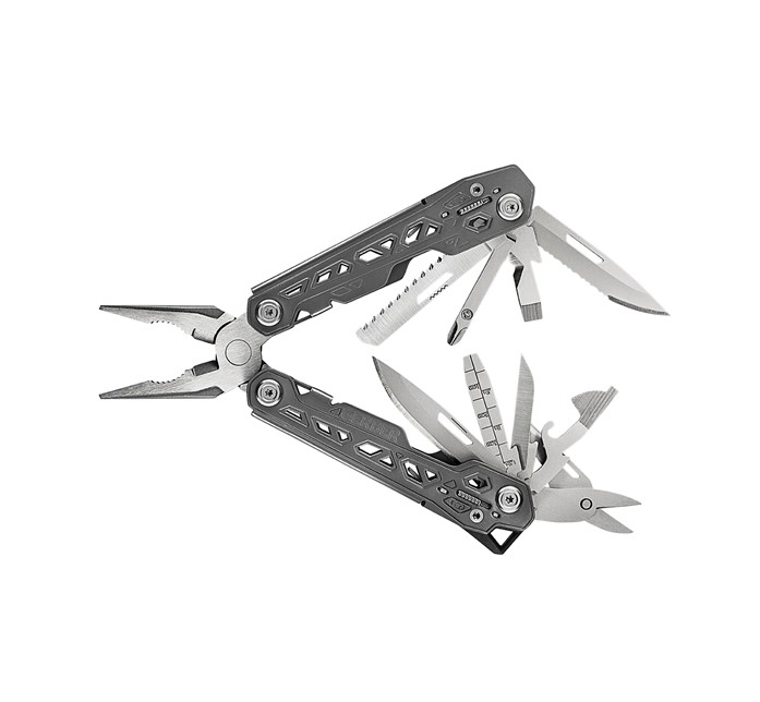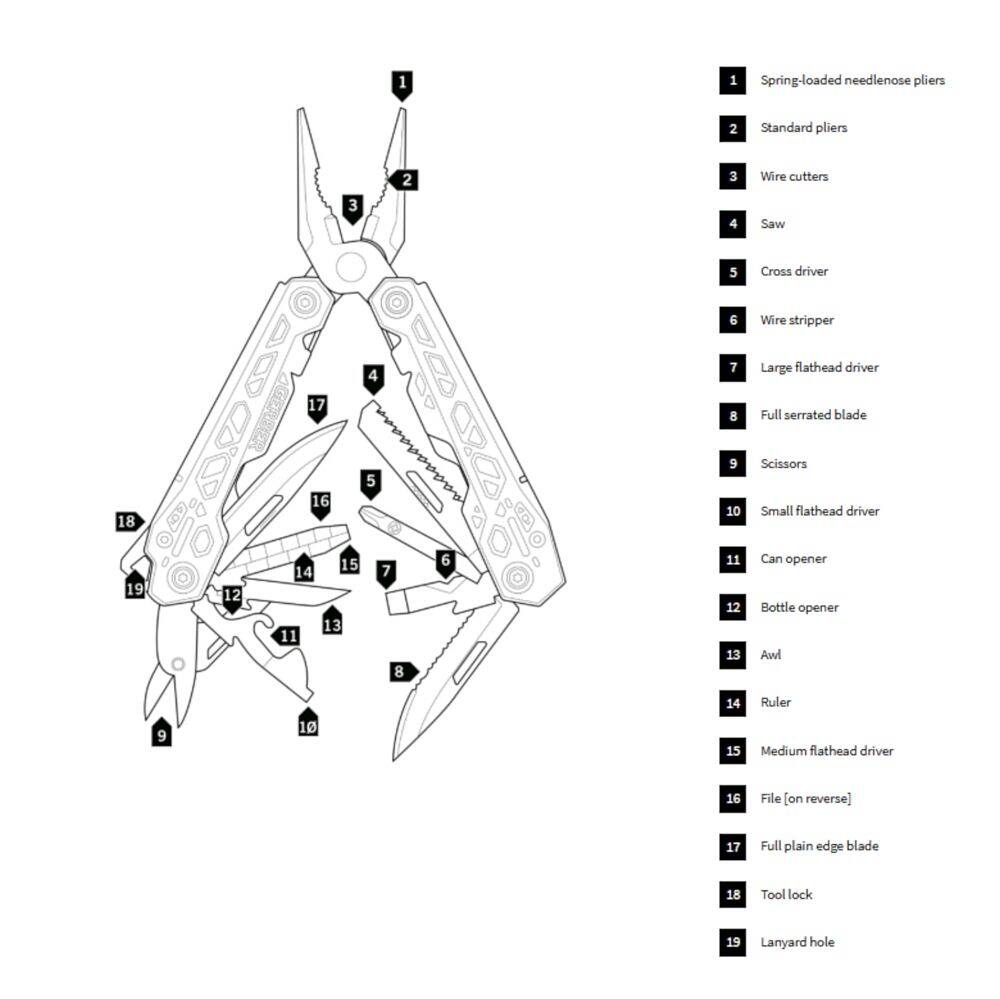 | Includes | Needlenose Pliers, Regular Pliers, Wire Cutter, 2.25-Inch Plain Edge Blade, 2.25-Inch Serrated Edge Blade, Scissors, Saw, Real Cross Driver, Small, Medium, Large Flathead Drivers, Can Opender, Bottle Opener, Awl, File, Ruler, Wire Stripper |