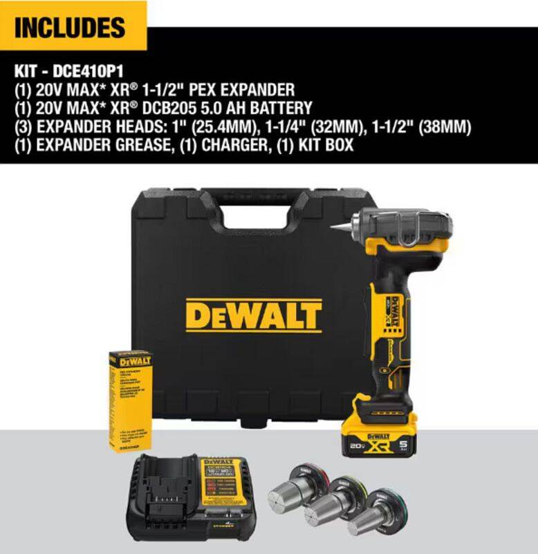 | Includes | Expander Tool, 1 20V Max XR 5AH Battery, Charger, 3 Expander Heads, Grease, Kit Box |