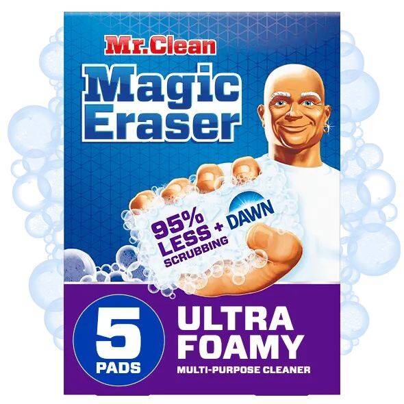 Mr. Clean Magic Eraser Ultra Foamy all purpose cleaner combines the cleaning power of Dawn with the scrubbing power of Magic Eraser for a clean like you’ve never seen. Just wet, squeeze, and let the foam help you erase 150+ messes* around your home - no more sponges or other cleaning products needed. This cleaning sponge has micro-scrubbers with added foaming cleanser cut through the toughest messes with 95% less scrubbing**. This all purpose cleaner works on tough and tricky messes all over the house—even outdoors. Clean sticky messes in the microwave, soap scum in the shower, rings in the bathtub, greasy counters, glass stovetops, patio furniture, permanent marker, wine stains, and more! Use as a wall cleaner and shoe cleaner, too! Add Mr. Clean Magic Eraser Ultra Foamy to your arsenal of cleaning supplies today.