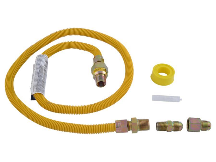 This kit includes (1) 48-IN 1/2-IN OD epoxy-coated gas dryer connector, (1) 1/2-IN MIP (Tapped 3/8-IN FIP) ArmorBoost™ EFV auto shut-off valve, (1) 3/8-IN MIP (Tapped 1/4-IN FIP) fitting, (1) 1/2-IN FIP fitting, (1) 1/2-IN MIP (tapped 3/8-IN FIP), (1) leak detector solution, (1) thread sealant. The gas connector is to be used for natural gas or LP water heaters, dryers, and moderate usage appliances. The connector is certified for indoor and outdoor use on appliances up to 60,500 BTUs. DuraCoat epoxy coating protects against corrosion, stains, and UV.