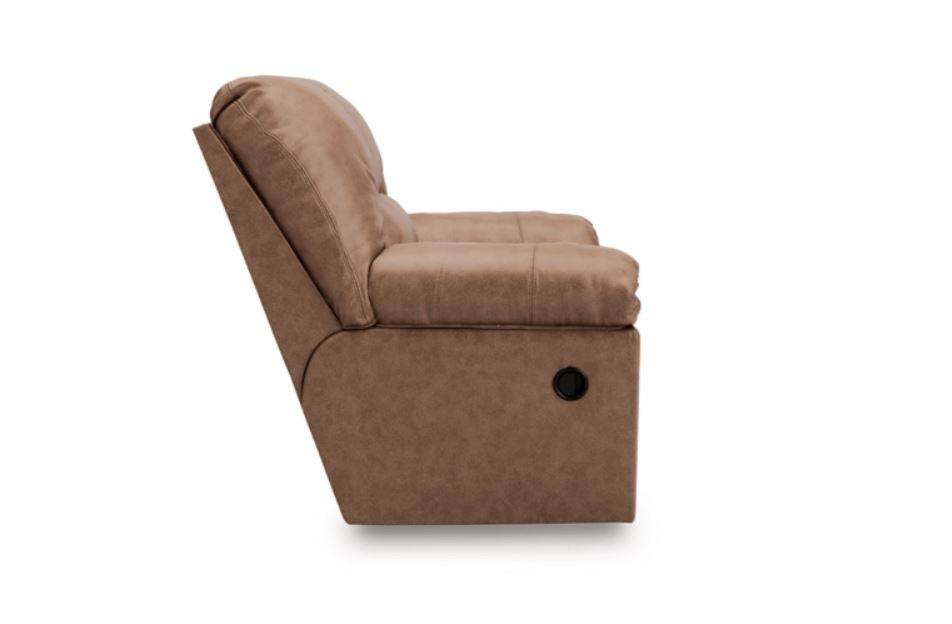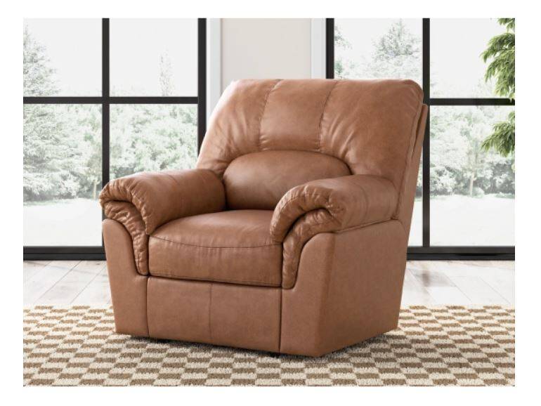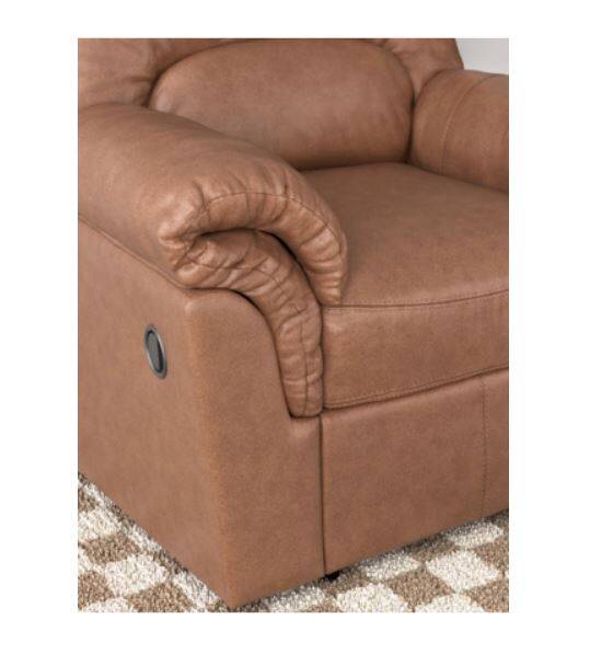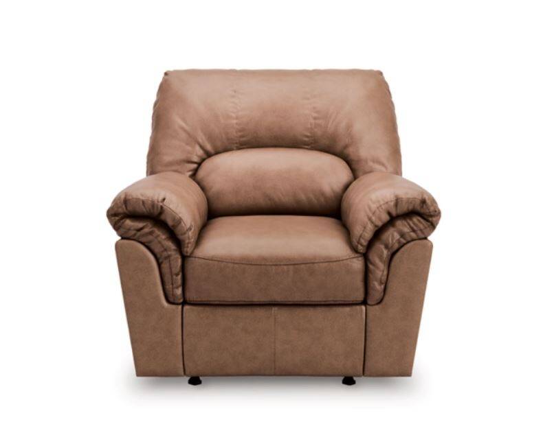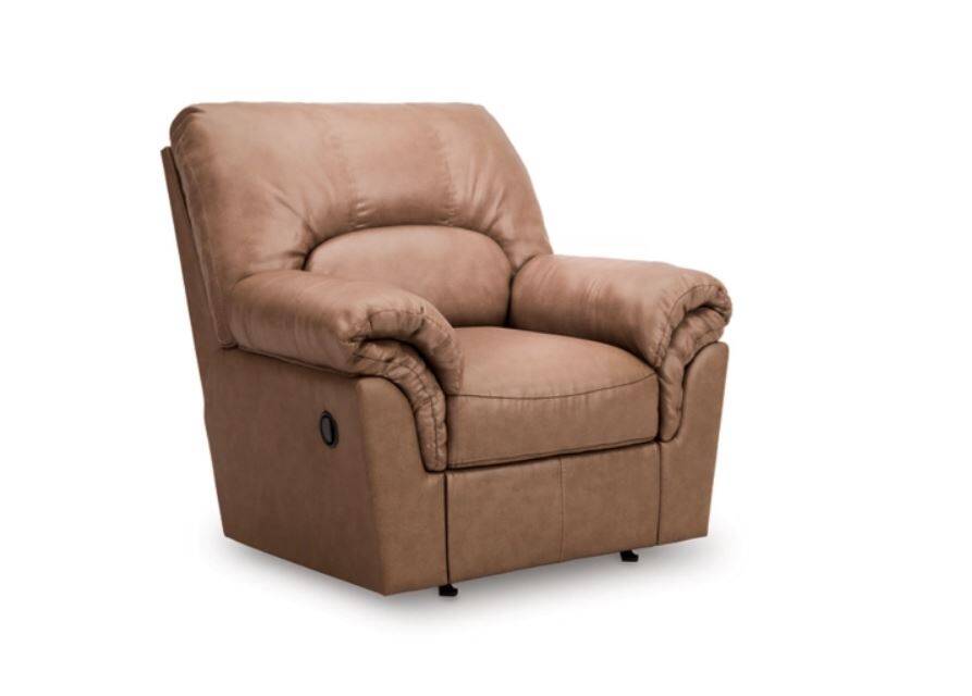 Modern comfort never looked so good. Sporting supremely soft yet durable cushions accented with high-fashion jumbo stitching, this stunning rocker recliner is the ultimate choice in comfortably cool, contemporary style. Its caramel-hued faux leather indulges with an upscale feel and wows like the real thing. And the recliner's pull-tab reclining makes it easy to kick back and relax.