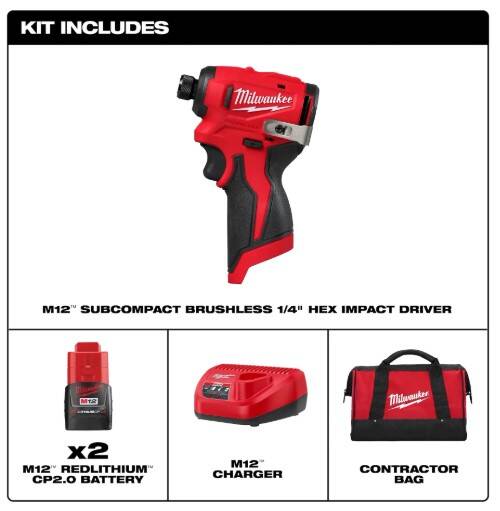 | Includes | (1) M12 Subcompact Impact Driver, (2) M12 REDLITHIUM™ CP 2.0 battery packs, M12 charger and contractor bag |