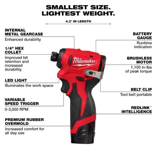 M12™ Subcompact Brushless ¼" Hex Impact Driver is the most compact and lightest weight cordless impact driver. It measures only 4.3" in length and 2.0" in width, allowing for the best access in tight spaces and weighs only 1.7 pounds with battery. This impact driver delivers unmatched portability and maneuverability for hard-to-reach fasteners. The brushless motor technology provides faster driving speeds with 1,100 in-lbs. of torque and up to 3,000 RPM to increase productivity. An internal metal gearcase delivers robust strength and durability. MILWAUKEE® REDLINK™ Intelligence communicates with the M12™ REDLITHIUM™ batteries to provide optimal performance for the tools. Kit includes M12™ Subcompact Impact Driver, (2) M12™ REDLITHIUM™ CP 2.0 battery packs, M12™ charger, and contractor bag. The M12™ Subcompact Brushless ¼" Hex Impact Driver is part of the M12™ system and is fully compatible with over 150+ solutions.
