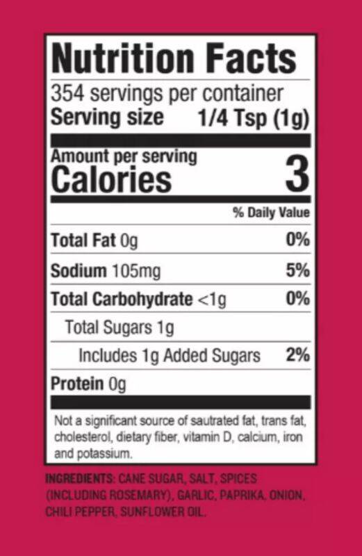 Ingredients Cane sugar, salt, spices (including Rosemary), garlic, paprika, onion, chili pepper, sunflower oil