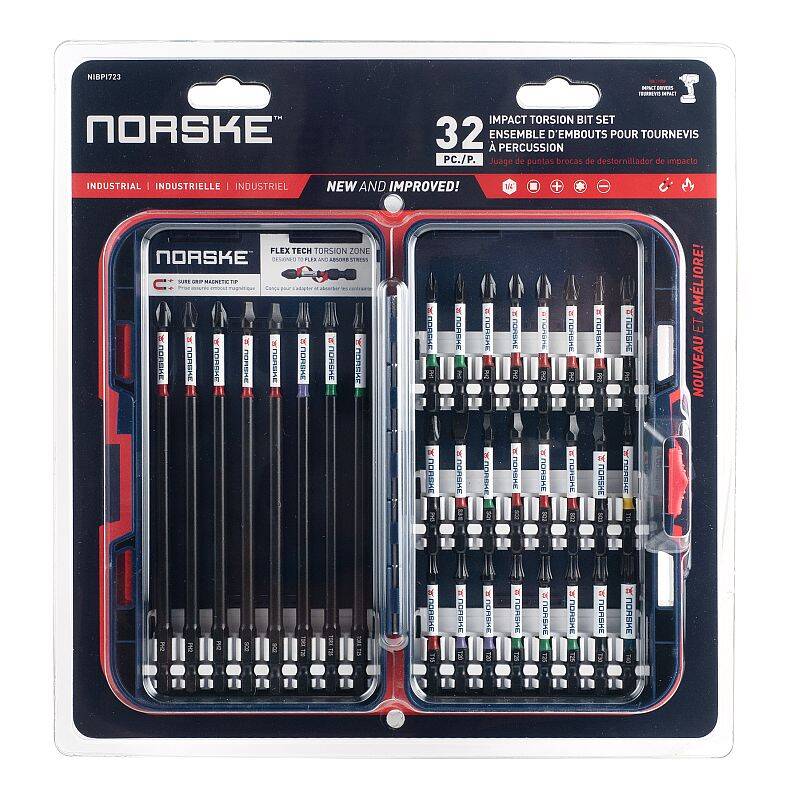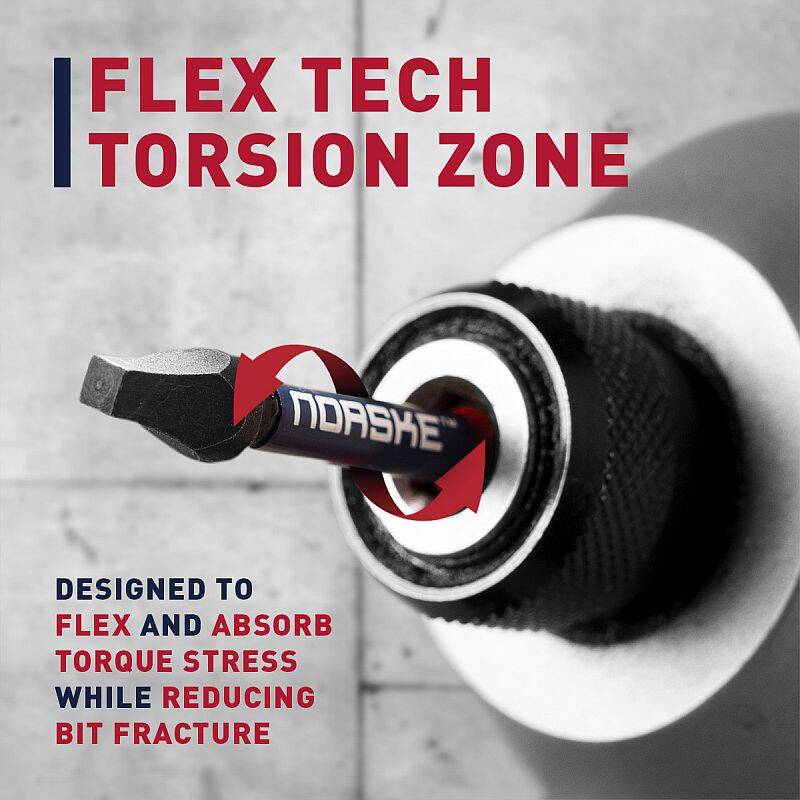 NORSKE⢠IMPACT TORSION driver bits are engineered to meet the rigorous demands of professional and industrial users. The optimized FLEX TECH TORSION ZONE flexes under load to take pressure off of the bit tip and reduce bit fracture resulting in less breakage.