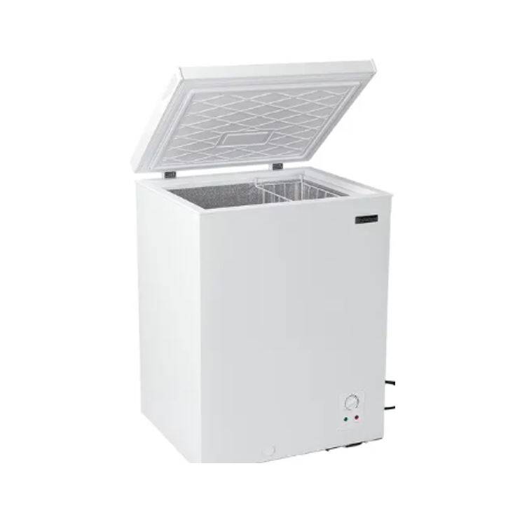 This 5.0 cubic foot freezer offers convenient storage with a single flip-up lid and an integrated handle for easy access. Designed with an adjustable temperature control and a defrost drain, it provides hassle-free maintenance, making it ideal for various storage needs.