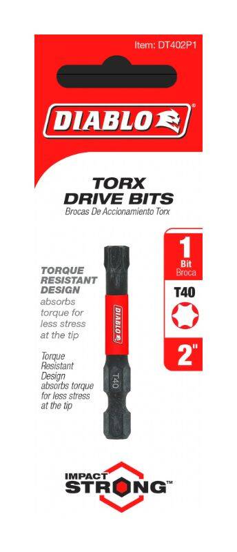 Diablo's range of Torx driver bits delivers maximum performance, extreme durability and up to 50X longer life when installing and removing fasteners. An optimized tip design provides a strong, precise grip that reduces wear, stripping and slippage. MaxTorque Zone delivers ultimate torque resistance by absorbing torque, creating less stress at the tip when tightening and removing nuts and screws. This range is Impact Strong™, delivering increased shank stability and durability in cordless and corded impact and drill drivers.