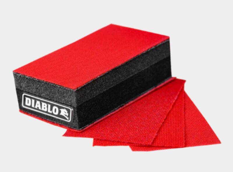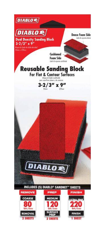 Diablo’s new Reusable Hand Sanding Block maximizes sanding performance by enabling professional users to sand flat and contour surfaces with one tool. This premium foam tool includes two sides: cushioned for controlled material removal in contour sanding, and dense for aggressive material removal on flat surfaces. Hook Lock™ backing allows repeated attachment and removal of Diablo SandNET™ sheets. Included with the Reusable Hand Sanding Block are five SandNET™ sheets, ranging from coarse/removal to ultra-fine finish. The reusable SandNET™ nylon design is easy to clean and reuse multiple times, simply shake, vacuum or rinse to remove any build up.