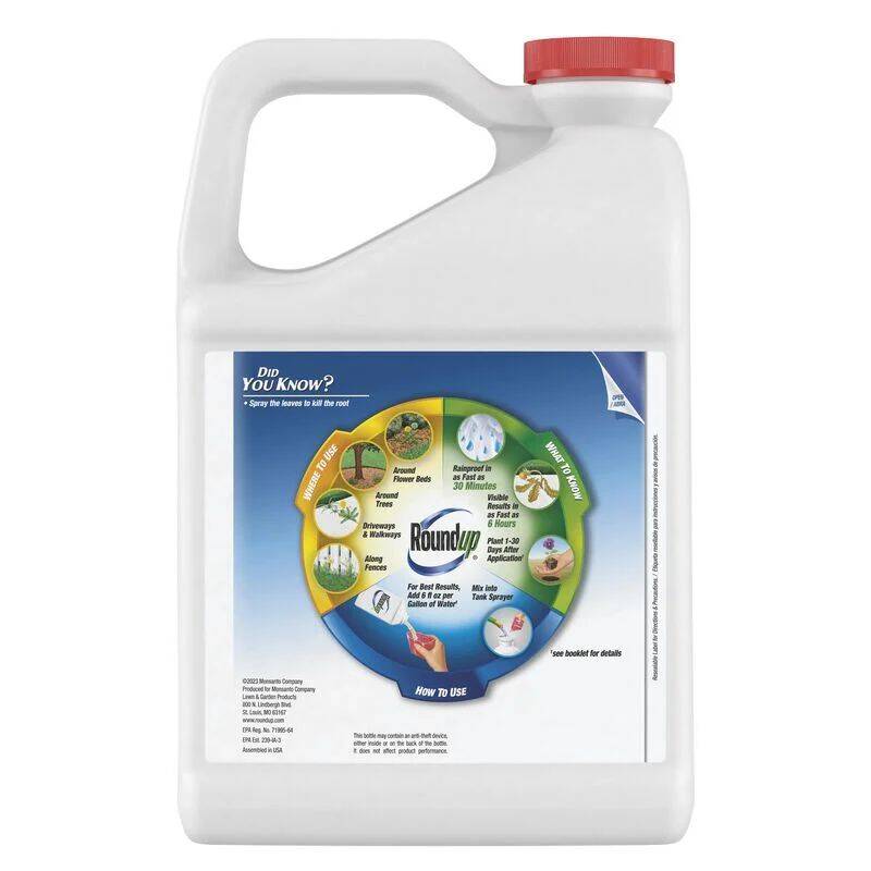 Take control of your outdoor space with Roundup® Weed & Grass Killer? Concentrate. It kills tough weeds and grasses to the root, including dandelion, large crabgrass, poison ivy, clover (red & white), spotted spurge, and other broadleaf weeds. It is rainproof in as fast as 30 minutes, produces visible results in hours, and allows you to plant 1 to 30 days after application (see booklet for details). Use Roundup® Weed & Grass Killer? Concentrate in flower beds, around trees, along fences, driveways and walkways, freshly cut woody stumps, in large areas for lawn replacement, garden plot preparation and other areas of your yard. Mix the concentrate according to label directions and spot treat or spray evenly each gallon of spray solution over 300 sq. ft. with a tank or hose-end sprayer. Do not allow people or pets to enter the treated area or touch treated plants until spray has dried. One 2.5 gal. bottle of Roundup® Weed & Grass Killer? Concentrate makes between 53 to 106 gallons (see booklet for mixing instructions) and covers up to 16,000 to 32,000 sq. ft.