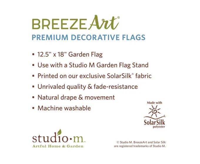 BreezeArt® Premium Flags are made of our exclusive SolarSilk® 600 denier polyester for greater durability, yet they have a softer, silkier feel for better drape and movement. Fade and mildew resistant. 12.5in x 18in. Flag stand sold separately.