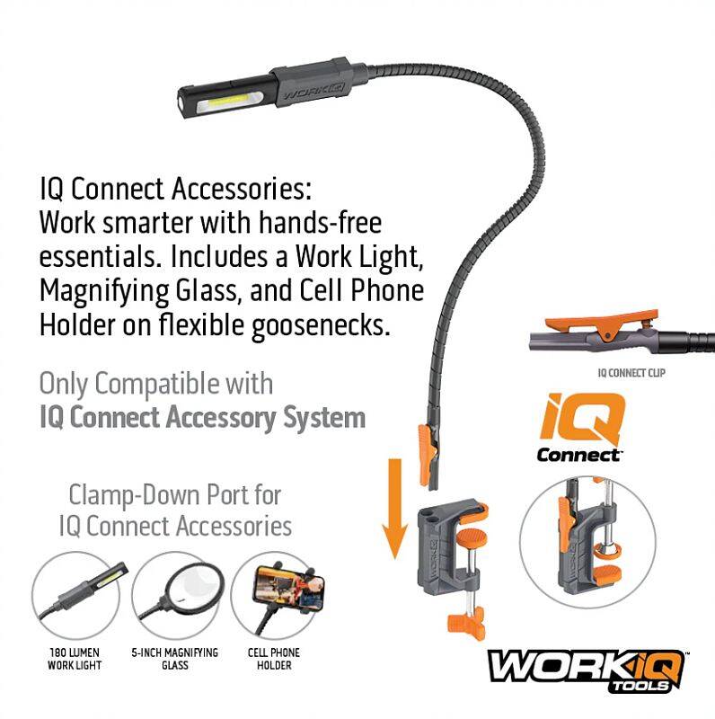 The IQ Connect™ – Clamp Mount was designed to provide the DIYer, Craftsman, Hobbyist, Maker, and Trade Professional with an additional mounting option for connecting the IQ Connect Hands-Free Accessories, including the IQ Connect Work Light, Magnifying Glass, and Cell Phone Holder. The Clamp Mount offers enhanced mobility, allowing you to move your IQ Connect accessories directly to your work area so you can get assistance where and when you need it.