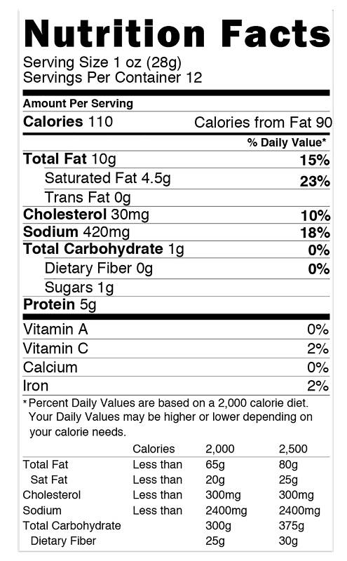 Nutritional Information 110 cal 10 g Total Fat 4.5 g Saturated Fat 0 g Trans Fat 30 mg Cholesterol 420 mg Sodium 1 g Total Carbs 0 g Dietary Fiber 1 g Sugars 5 g Protein