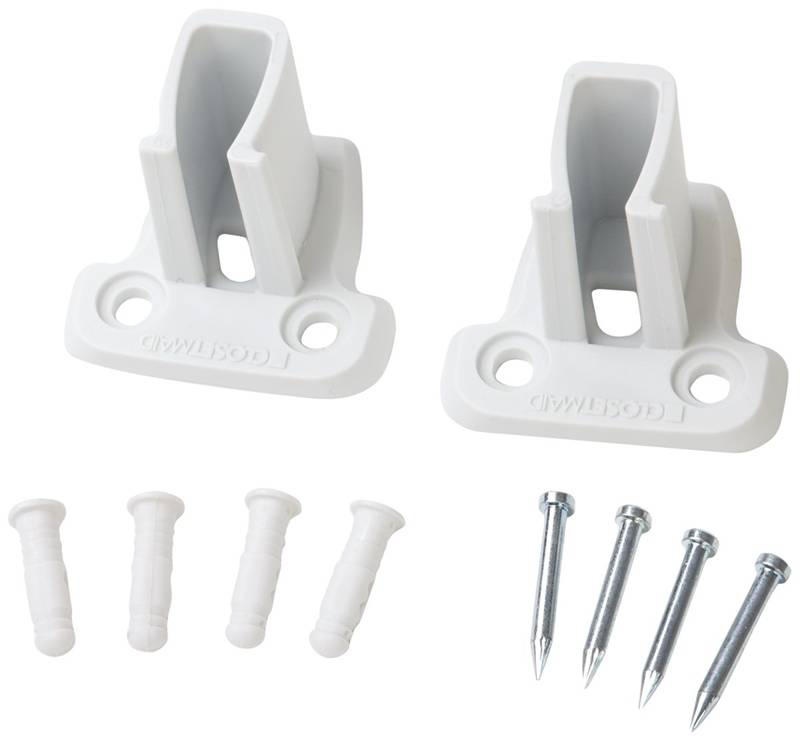 Supports low profile SuperSlide shelving in a wall to wall installation. Includes: 2 wall brackets, 4 pins and 4 anchors. Use in conjunction with support brackets and wall clips for installing wire shelving. Supports front lip of shelving where it meets the side wall. 2 in H x 2.19W x 1.75 in D.