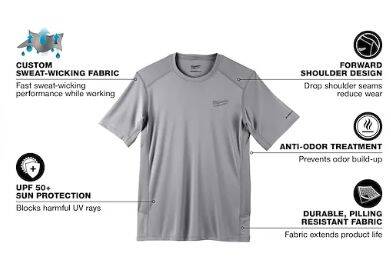 Part of the MILWAUKEE® WORKSKIN™ Collection, our Short Sleeve Lightweight Performance Shirt is BUILT TO FIGHT SWEAT. Our WORKSKIN™ Lightweight Performance Short Sleeve Shirt is designed for tradesmen who need their next-to-skin layer to dry fast, keep them cool, and protect them from harmful UV rays. Get a work shirt that matches your level of performance every day with a MILWAUKEE® WORKSKIN™. These high-performance work shirts are made from moisture-wicking fabric that helps you stay dry, while the 100% polyester material dries fast and resists wrinkles, unlike standard cotton base layers. The relaxed fit and raglan sleeves allow you to move freely to accomplish any task for comfortable all day wear.