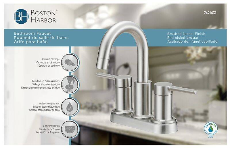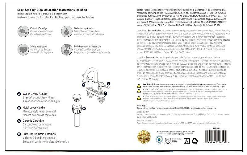 The Boston Harbor lavatory faucet with plastic pop-up is constructed of durable metal and has a metal lever handle, hybrid waterway, ceramic cartridge, 1/2-14 NPSM inlet, 4 in centers, IAMPO and NSF certified and max 1.2 gpm at 60 psi.