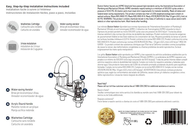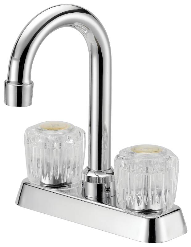 Chrome, acrylic round handle, durable metal construction, hybrid waterway, washerless cartridge, 1/2-14 NPSM inlet, 4 in centers, IAMPO and NSF certified, max 1.8 gpm at 60 psi.