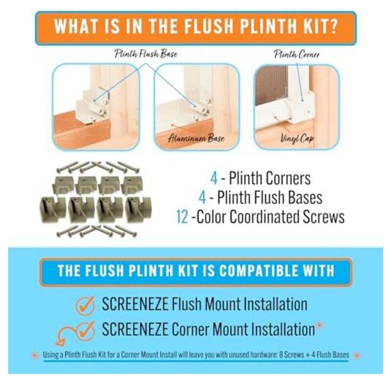 The Plinth Kit Includes 4 Corners, 4 Flush Bases, & 4 Color Coordinated Screws. Plinth Kits allow you to straight cut the aluminum base & vinyl cap instead of mitering the corners at 45 degrees. Eliminates Mitered Corner – This Snaptrack and SCREENEZE Plinth Kit allows you to straight cut the aluminum base frame & vinyl cap instead of mitering the corners at 45 degrees. Simplify the cutting process with the Snaptrack and SCREENEZE Corner Plinth Kit, making it more accessible for DIYers and reducing the chances of mistakes.