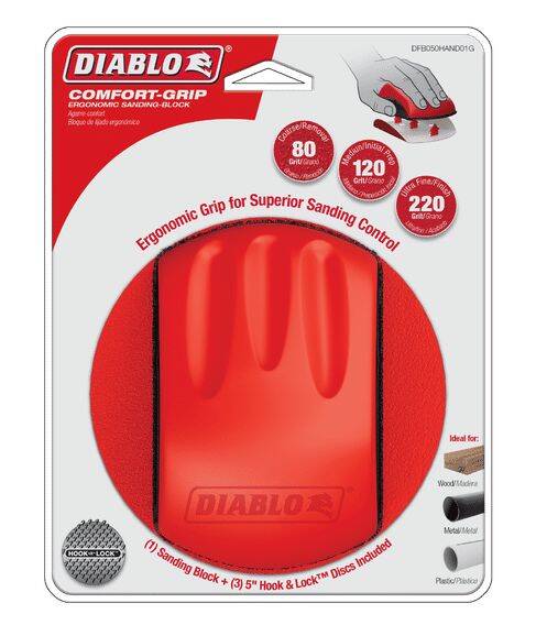 Diablo's premium Comfort-Grip™ Hand Sanding Block with random orbital sanding (ROS) discs includes break-through innovation to improve comfort, increase control, and extend sanding life in a variety of sanding applications. Featuring a premium durable foam, the Comfort-Grip™ ergonomic design fits comfortably in any size hand allowing for extended use and superior sanding control. A three-sided sanding block design enables the sanding disc to wrap around the bottom and both sides for sanding hard-to-reach areas. The Hook Lock™ backed block and sanding discs include a premium ceramic grain blend to remove material faster and offer longer sanding life than standard sanding discs. Clog-SHIELD™, Diablo's own blend of grinding agents, reduces loading thus maximizing productivity. The superior grain bonding system, ENDURA-BOND™, provides Diablo's sanding discs with longer life and extreme durability.