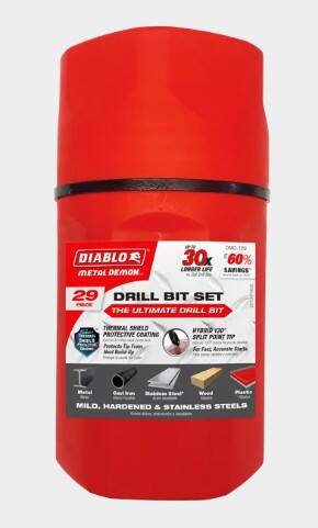 Diablo's Metal Demon™ Drill Bits redefine metal drilling with the industry’s first three-in-one bit to tackle all metals: mild, hardened, and stainless steels. Long-gone are the days where professionals must purchase and carry multiple bit types (Titanium, Cobalt, and Black Oxide), the Metal Demon™ bit’s exclusive design brings a one-bit solution for any application ensuring maximum durability, speed, precision, and productivity. Diablo’s proprietary Thermal Shield Protective Coating™ creates a multi-layered protective barrier around the tip to shield against heat, maximizing durability and increasing the bit’s life up to 30-times longer than Titanium, Cobalt, or Black Oxide metal drill bits. Cutting Edge™, an automated precision CNC grinding process, ensures strict industrial standard angle tolerances that create a cutting motion to minimize bit wear allowing for faster hole drilling up to 2-times than other bits. A 130-degree Hybrid Split Point Tip design creates fast, on-point starts in both stationary and handheld drills. Productivity is now a concern of the past. Metal Demon’s ability to drill up to 50% more holes per battery charge ensures professionals can complete more in less time. An optimized flute design removes metal debris faster, keeping the tip cooler for ultimate strength and durability in all metal drilling applications.