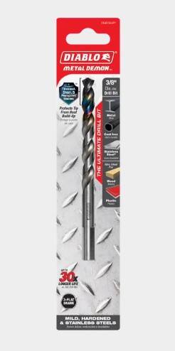 Diablo's Metal Demon™ Drill Bits redefine metal drilling with the industry’s first three-in-one bit to tackle all metals: mild, hardened, and stainless steels. Long-gone are the days where professionals must purchase and carry multiple bit types (Titanium, Cobalt, and Black Oxide), the Metal Demon™ bit’s exclusive design brings a one-bit solution for any application ensuring maximum durability, speed, precision, and productivity. Diablo’s proprietary Thermal Shield Protective Coating™ creates a multi-layered protective barrier around the tip to shield against heat, maximizing durability and increasing the bit’s life up to 30-times longer than Titanium, Cobalt, or Black Oxide metal drill bits. Cutting Edge™, an automated precision CNC grinding process, ensures strict industrial standard angle tolerances that create a cutting motion to minimize bit wear allowing for faster hole drilling up to 2-times than other bits. A 130-degree Hybrid Split Point Tip design creates fast, on-point starts in both stationary and handheld drills. Productivity is now a concern of the past. Metal Demon’s ability to drill up to 50% more holes per battery charge ensures professionals can complete more in less time. An optimized flute design removes metal debris faster, keeping the tip cooler for ultimate strength and durability in all metal drilling applications.