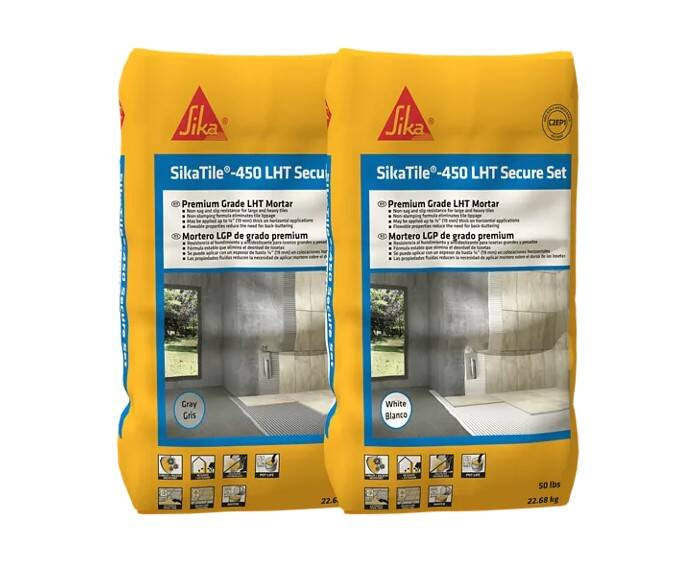 SikaTile®-450 LHT Secure Set is a premium grade, single-component, non-sag, non-slip polymer-modified mortar for interior and exterior setting of large and heavy tile and natural stone. It may be applied from at 3/32" to 3/4" (2.4 mm to 19 mm) thickness to provide better support under large and heavy tiles and stone and can be used for both interior and exterior installations of tile in most residential and commercial floor and wall applications. SikaTile®-450 LHT Secure Set, features innovative Dustless Technology producing approximately 80% less dust than ordinary thin sets and is designed to promote cleaner working conditions and reduce mess. It uses less water and is creamier and easy to spread.