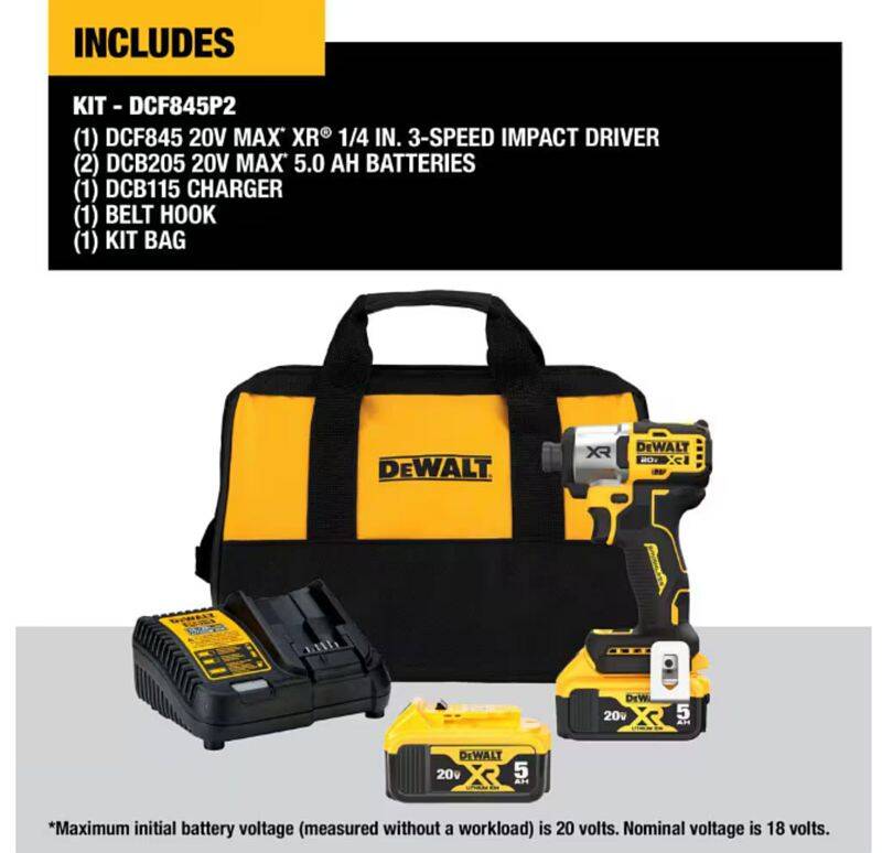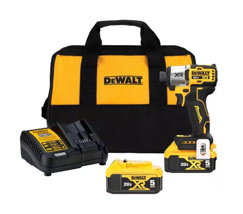 Experience Power™ and drive large diameter screws with the 20V MAX* XR® 1/4-inch 3-Speed Impact Driver. Featuring a compact design and 3-speeds, this powerful impact driver delivers 1,825 in-lbs. of max torque and premium user control for a variety of applications. This kit is packaged with (2) 20V MAX* 5Ah batteries, a charger, and a durable storage bag for portability on the jobsite.