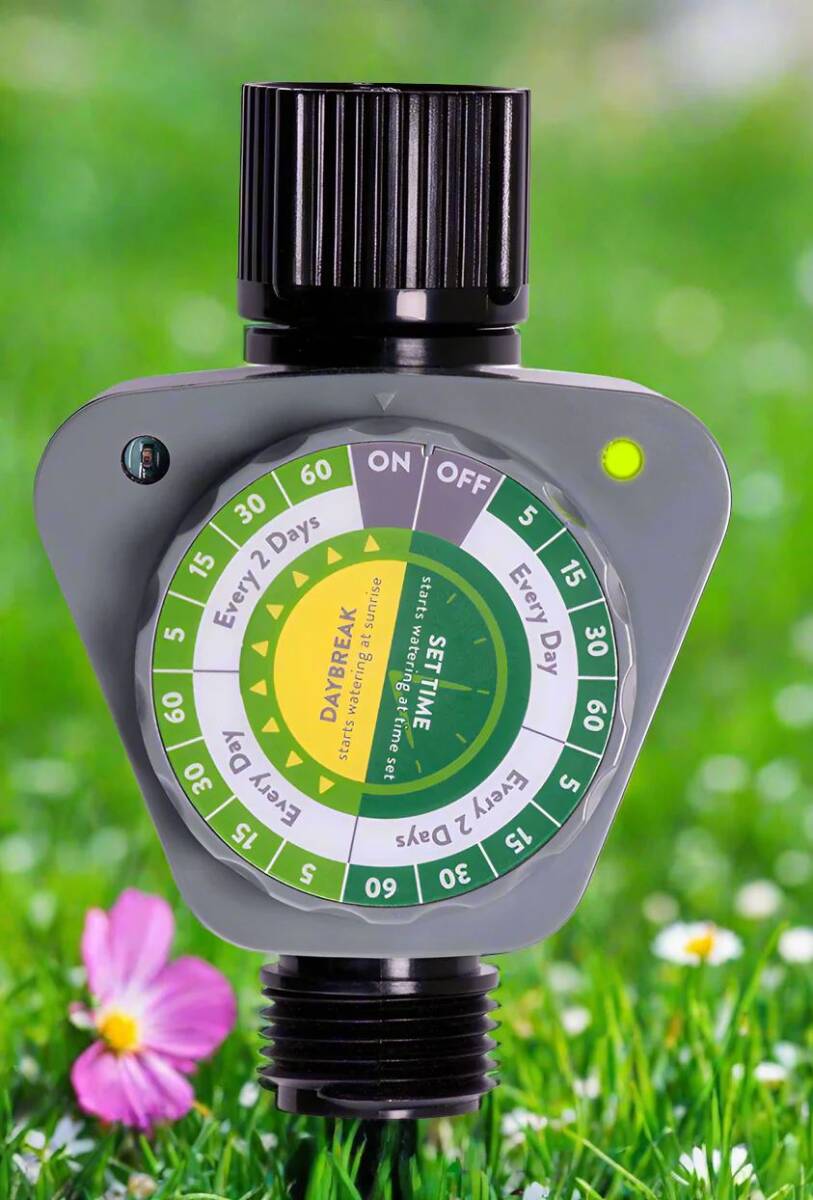 Have a dry spot you keep forgetting to water or do you continue to forget to turn your sprinklers off wasting money and water? The Daybreak timer will fix these problems as it will allow you to water in two simple ways. Choose to water with the Daybreak side to have the timer automatically turn on when it detects sunlight or choose to set a time and have the timer continue to water at that set time until settings are altered. The oversized dial is easy to operate even with gloved or wet hands. For added convenience, it is equipped with a manual watering option, so you don’t have to remove the timer to use your faucet. To use, simply twist the dial to your desired watering duration, choose to water every day or every other day in 5, 15, 30, or 60-minute increments, and the timer will turn itself off upon completion. You’ll never have to worry about forgetting to shut the sprinkler off again!