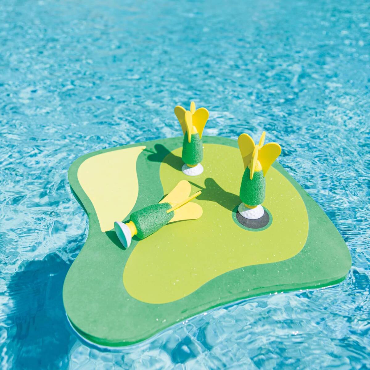 This inventive twist on golf can be played on land or water, and inside or out. Includes a putting green board and 3 golf-ball-themed sucker darts. Aim each golf-ball themed dart at the putting green foam target board. Try to get a hole in one but watch out for the sand trap! Play on any flat surface, this foam putting green board measures 14.25 x 13.5 x 3 inches and is fun for the whole family. Waterproof, this game floats in the pool. Suitable for indoor, outdoor play.