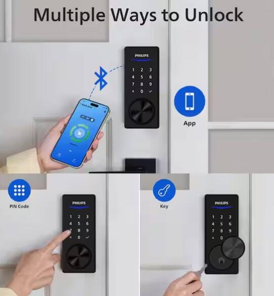Unlock your door in 3 convenient ways with the Bluetooth smart deadbolt and Wi-Fi bridge combo. Choose between a PIN code, traditional keys or the Philips Home Access app.