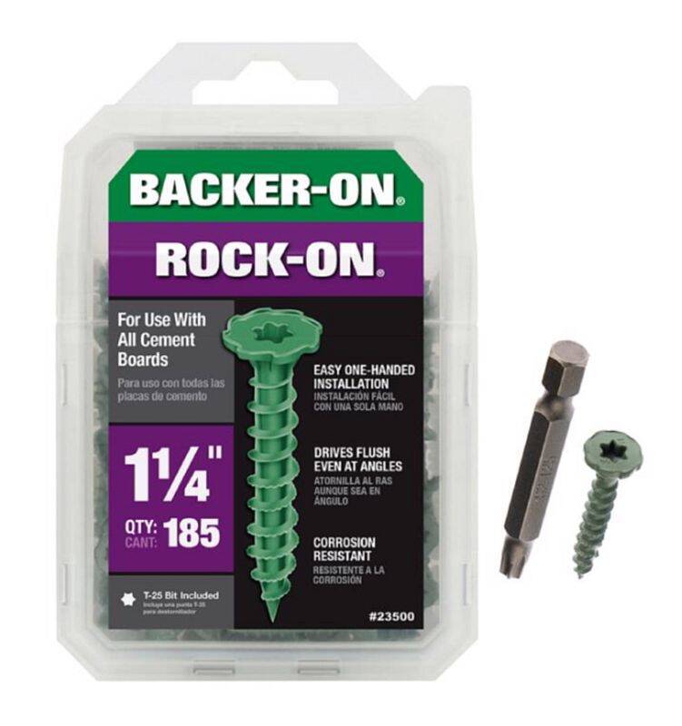Backer-On Rock-On 1-1/4 in. cement board screws are designed for attaching Hardie Backer or equivalent fiber cement backer board to wood or light gauge steel studs. Backer-On Rock-On's patented serrated head design countersinks for flush seating at any angle, providing a smooth surface for tile. The Star drive recess with T-25 bit provides Stikfit for 1-handed installation. Backer-On Rock-On screws feature a Climacoat corrosion-resistant finish that prevents rust from bleeding into the grout and are perfect for use in high-moisture areas such as baths, showers, countertops, and floors. Conforms to ANSI A108.11 for cement board attachment. Backer-On Rock-On screws can be installed with a standard impact or drill/driver and product) for cement board fastening done right.
