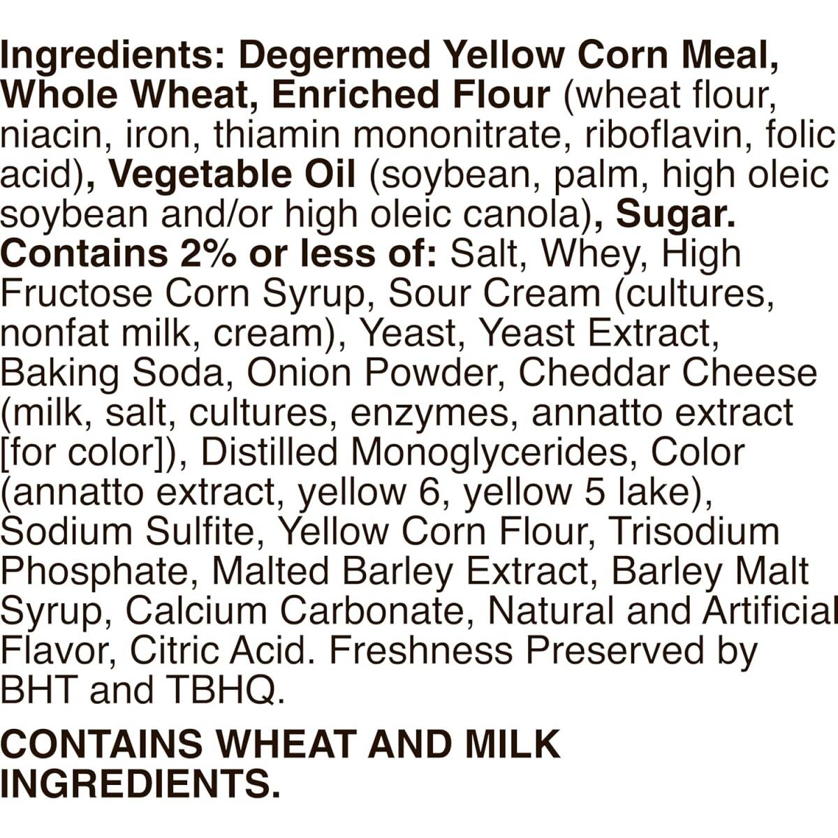 | Ingredients | Degermed Yellow Corn Meal, Whole Wheat, Vegetable Oil (soybean, high oleic canola, high oleic sunflower, palm and/or high oleic soybean), Enriched Flour (wheat flour, niacin, iron, riboflavin, thiamin mononitrate, folic acid), Sugar, Salt. Contains 2% or less of: Whey, Sour Cream (cream, cultures, nonfat milk), Cheddar Cheese (milk, salt, cultures, enzymes, annatto [color]), Yeast, Yeast Extract, Onion Powder, Baking Soda, Distilled Monoglycerides, Color (annatto extract, paprika extract, turmeric extract, yellow 6, yellow 5 lake), Barley Malt Syrup, Malt Syrup, Yellow Corn Flour, Trisodium Phosphate, Calcium Carbonate, Natural and Artificial Flavor. Freshness Preserved by BHT. |