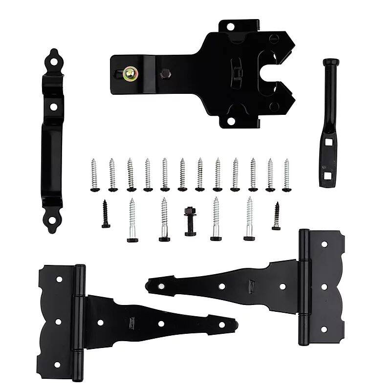 National Hardware's Deluxe Latch Decorative T-Hinge Gate Kit is designed for a variety of outdoor applications, including wood, steel, or vinyl. Black plated steel finish for style and durability.