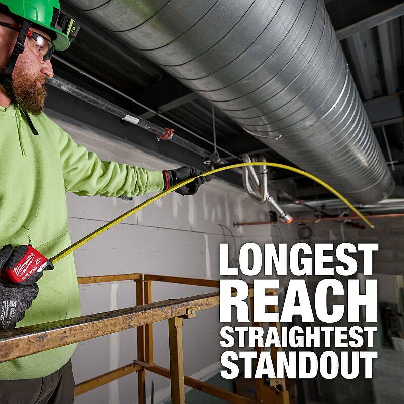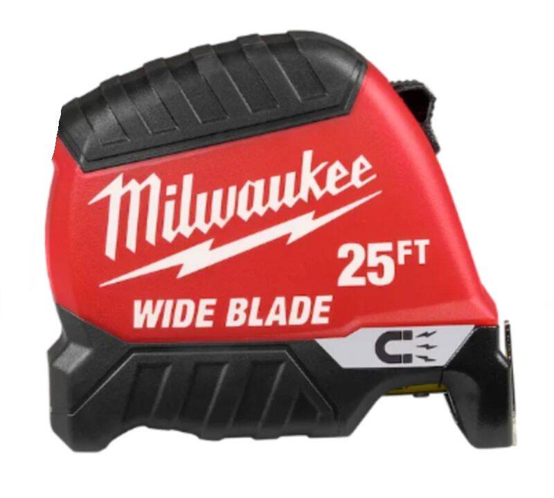 Our 25-ft Wide Blade Magnetic Tape Measure delivers the longest reach and straightest standout in the industry. 18-feet of Reach and 15-feet of Standout allows you to take long measurements on your own and reach further on the jobsite. The Wide Blade Magnetic Tape Measure features a finger stop for quick, controlled blade retraction and double-sided anti-tear coating that reinforces the first 6-inches of the blade. This tape measure is equipped with a low-profile magnet and large hook for improved top and bottom hook grab onto common jobsite materials, and double-sided printing for measuring in different orientations. Built to withstand the jobsite, this tape is equipped with a fully reinforced impact resistant body and a wire form belt clip to reduce pocket tearing.