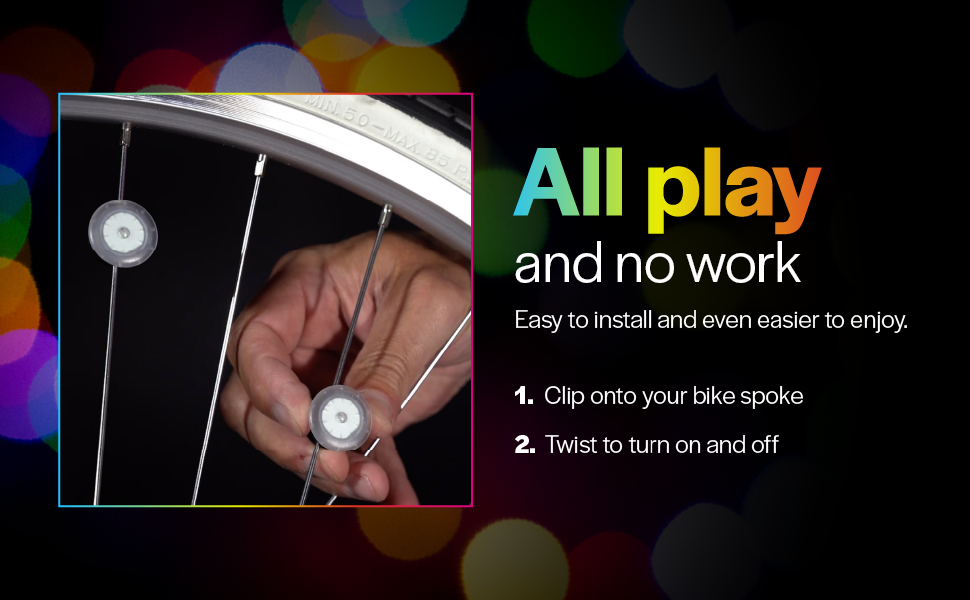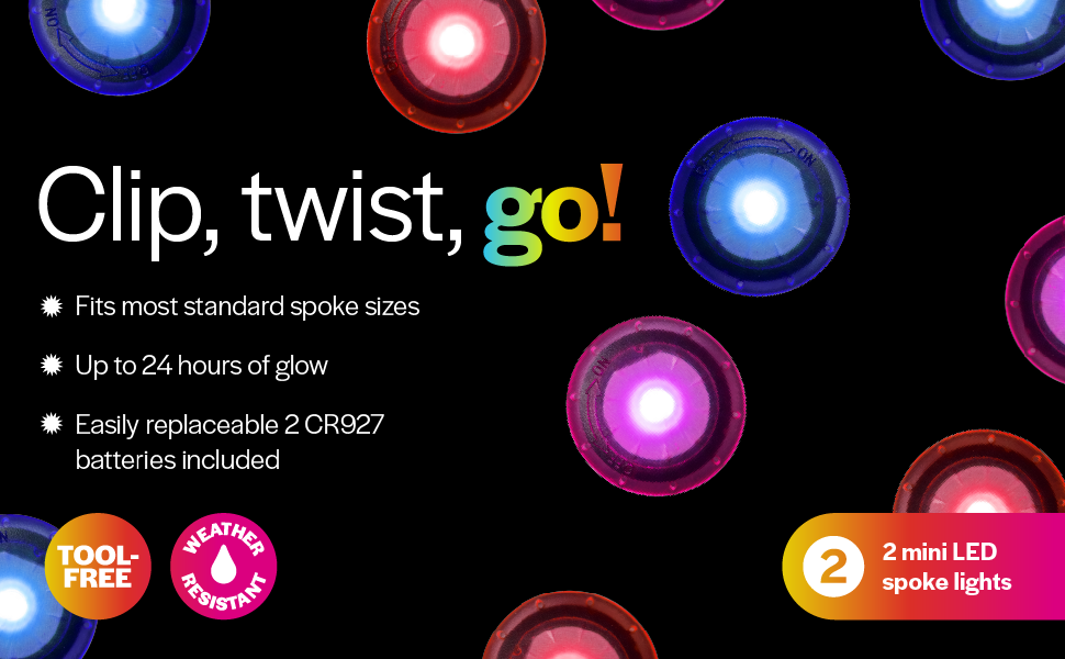 Clip these mini LEDs to your bike spokes, twist on, and you’re ready to roll in seconds! These easy spoke lights are the perfect accessory to add a pop to your wheel.