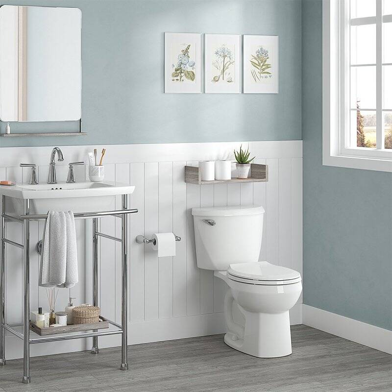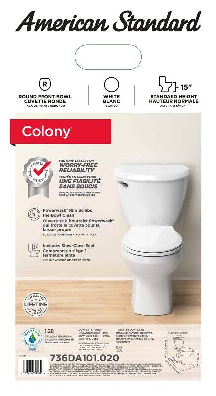 The Colony Round Front toilet is a space saver and offers great performance using 20 percent less water compared to a standard ultra low flush toilet, using only 1.28 gallons per flush.