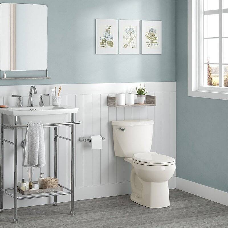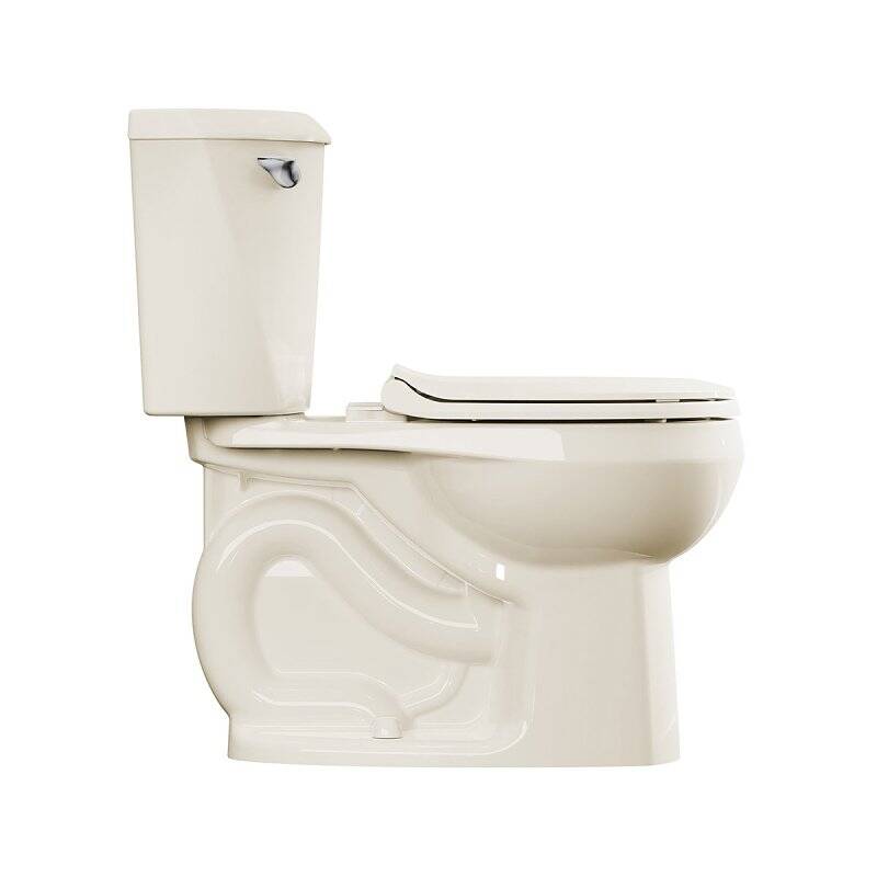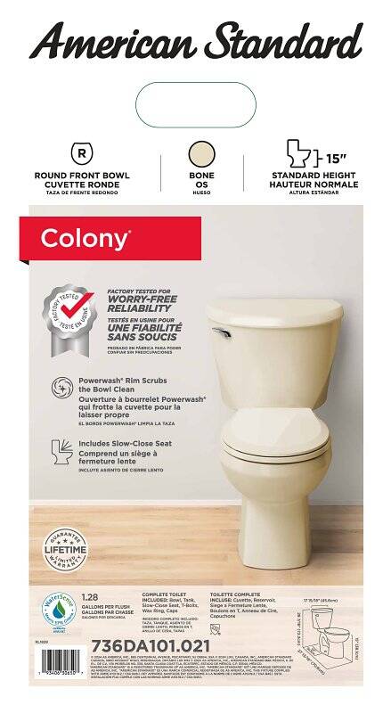 American Standard Complete Toilet, Flush Rate: 1.28 gpf, Bowl Shape: Round Front, Water Surface Area: 9 x 8 in, Rough-In Size: 12 in, Trapway Size: 2 in, Flush Valve Size: 3 in, Overall Dimensions: 25.69 in H x 16.63 in W x 26.38 in D, Rim Height: 15 in, Vitreous China, Bone, Floor Mounting, Includes: Bolt Caps, Bowl, Color Matched Seat, Tank, Trip Lever and Wax Ring