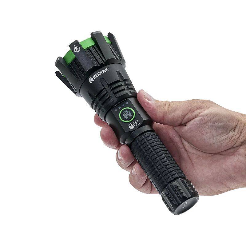 The Kodiak Krusader is a rechargeable, bright, durable tactical grade flashlight with up to 5000 lumens in the turbo brightness mode. New easy to operate safety lock prevents unwanted operation. Rubber comfort grip, focus beam and a long lasting 2600 mAh battery round out the features.