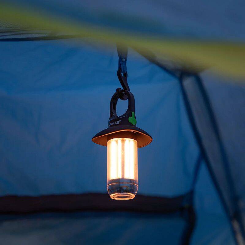 This is a compact LitezAll lantern with a built-in flashlight. Enjoy 3 lantern modes with beautiful warm white light, perfect for tents and campers. You may also use the integrated flashlight when needed. The light may be conveniently hung or carried by its built-in handle/hanging hook. Easily remove the rubber shade for wider light coverage. The light is rechargeable and the charging cable is included.