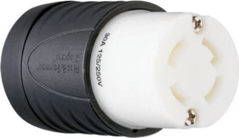 Pass & Seymour Turnlok Locking Connector, 125/250 V, 30 A, 3 Pole, 4 Wires, 18 to 8 AWG Cable/Wire, Grounding Type: Grounded, IP20 IP, -40 to 75 deg C Operating, Nylon, Black/White, Dimensions: 2.2 in Dia x 3.33 in L, NEMA L14-30R