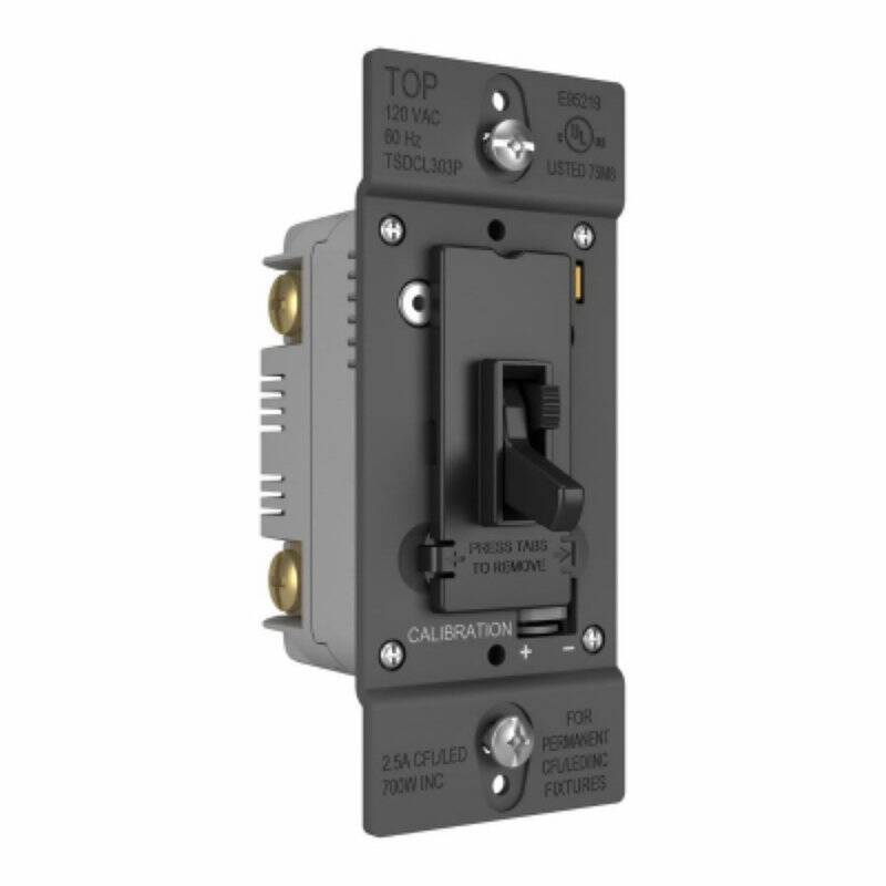 TradeMaster® toggle slide dimmer is designed for use with compact fluorescent or LED lighting fixtures. This single pole three-way switch can be used in a two-location layout. The slide can be set to your preferred level and then toggle on and off providing instant repeatability. This switch offers dependability and a lifetime warranty.