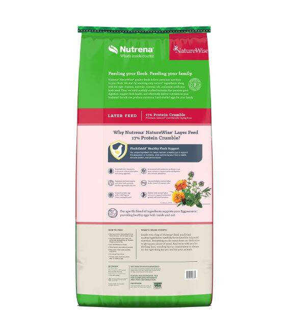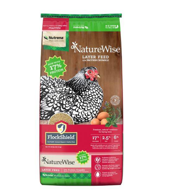 NatureWise® Layer Crumble Poultry Feed (now with 17% protein!) is a specially designed formula enriched with vitamin D3 and essential oils for healthier hens and eggs, maximized egg production, superior eggshell strength, and noticeably vibrant egg yolks. Why more protein? The increased protein supports your bird’s body condition and overall bird health. Crumble form encourages consumption and is necessary for smaller breeds such as bantams. It’s an ideal choice to provide advanced nutrition to your laying hens.