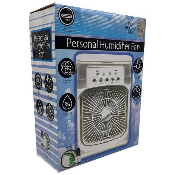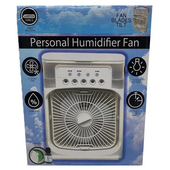The White Small Portable Personal Cooler Humidifier Fan is a versatile and compact device for home and office use. With 5 spray heads and a 600ml water tank, it offers three adjustable mist levels—low (1 spray for 12 hours), medium (3 sprays for 4 hours), and high (5 sprays for 2.5 hours)—providing customizable cooling and humidification to suit different needs. This multi-functional unit is a mini air cooler, mist humidifier, desk fan, and night light. It features a 60-degree adjustable angle, 3 wind speeds, and a built-in timer with options for 1, 2, or 3 hours of operation. The fan also includes 7 LED night light color options to create a calming atmosphere. Designed for convenience, it is USB powered, comes with a cable, and includes a leather-like handle for easy carrying. Its quiet operation and compact size (8.4 in x 3.9 in x 10.81 in) make it ideal for personal spaces, offering a practical and stylish solution for staying cool and comfortable anywhere.
