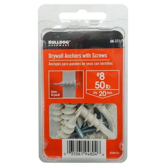 Ensure sturdy and secure mounting for your fixtures and décor with the Bulldog 20 Piece #8 50lb Drywall Anchors and Screws Set, the ultimate solution for all your hanging needs. Crafted with precision and durability in mind, these anchors are designed to provide reliable support for objects weighing up to 50lbs. Made from high-quality materials, they offer exceptional strength and stability, ensuring your items stay safely in place. The included screws are perfectly matched to the anchors, providing a seamless installation process. Whether you're mounting shelves, mirrors, or artwork, this set has you covered. Easy to install and versatile in application, the Bulldog Drywall Anchors and Screws Set is a must-have addition to any home or workspace, offering peace of mind and confidence in your wall-mounted fixtures.