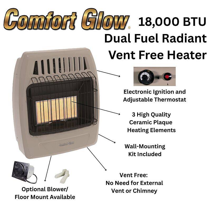 Comfort Glow 18,000 BTU Gas Heater for Indoor Use, Infrared Radiant Vent-Free, Natural Gas/LP, Thermostat, 800 Sq. Ft. Heat, Electric Ignition, 99.9% Efficient